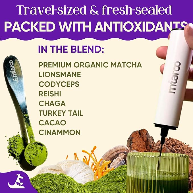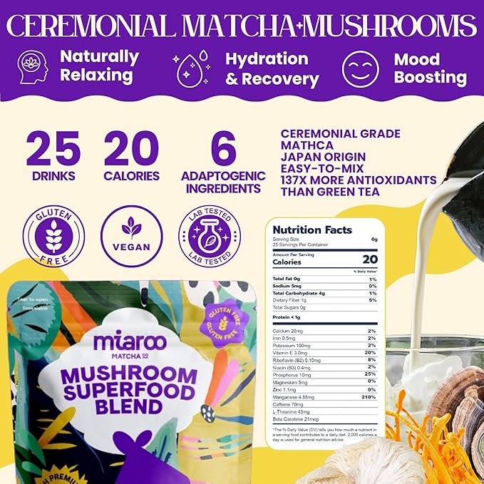 - Mood Enhancer & Cognitive Support: Our Matcha Mushroom Blend combines the focus-enhancing properties of ceremonial matcha with the adaptogenic effects of mushrooms like Lion’s Mane and Reishi, promoting a calm, focused mind and supporting gut health for overall wellness.