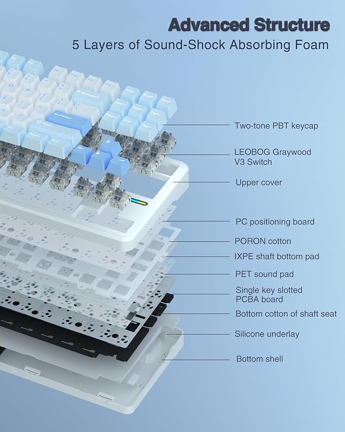 - Hot Swappable Keyboard with Programmable Driver: This wireless gaming keyboard supports 3-pin/5-pin hot-swappable, which makes it easier to DIY your personalized creamy keyboard. The PC keyboard adopts pre-lubricated LEOBOG Graywood V3 Switch for more precise and smooth tapping, and does not cause program conflicts when pressing multiple keys at the same time. With programmable drivers, the custom keyboard allows you to set shortcuts and key combinations according to your usage habits. Full keys support for macro recording and editing, increasing the probability of winning the game