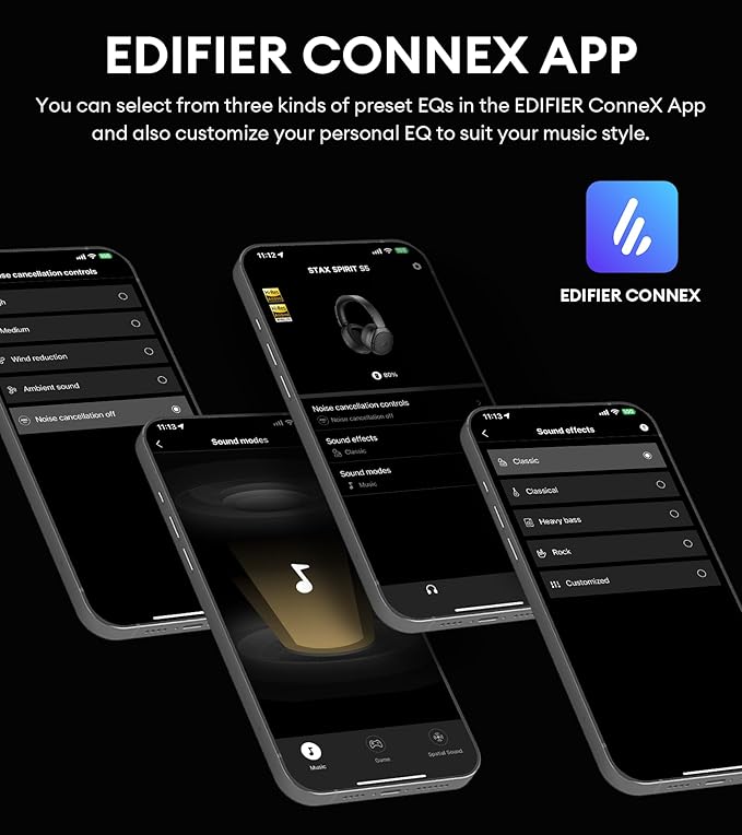 - [Edifier ConneX APP] Explore the EDIFIER ConneX App for enhanced features such as personalized EQ, control options, and cushion settings. Choose from three preset EQ modes or tailor your own EQ settings to match your unique music preferences.