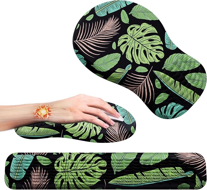 MEKASS Ergonomic Mouse Pad and Keyboard Wrist Rest Set, Super Soft Memory Foam Desk Wrist Support for Computer Keyboard, Non-Slip Arm Palm Rests Cushion for Typing Gaming Office (Large Green Leaves)