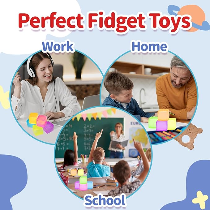 - 【Durable, Soft and Squishy】These stress anxiety toys are made of thick TPR outer layer and filled with high-density flowing gel, resilience against heavy use. Extremely flexible filler helps balance gripping and finger dexterity through repeated squeezing. Fidget toys and anxiety cubes also can be great desk toys for when you need to calm down and concentrate on the task at hands.