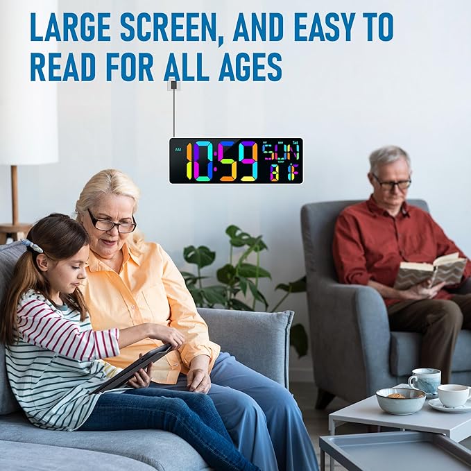 - [11 RGB color digital display + 9 RGB night light] The digital wall clock is available in 5 RGB color modes and 6 monochrome modes. What's more, the large digital clock offers not only an automatic brightness mode, but also 4 levels of adjustable brightness, allowing you to easily adjust the color of the clock to your personal preference or current environment.