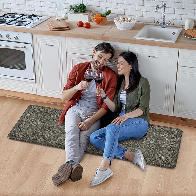 - Anti-fatigue Kitchen Mat : Ergonomic cushioned kitchen floor mats are constructed with 0.47inch (12mm) extra thick, long-lasting anti-fatigue memory foam center providing the ultimate comfort for your feet, back and legs.Feel comfortable like walking on a firm but soft cloud when you are cooking in kitchen or working at your standing desk.