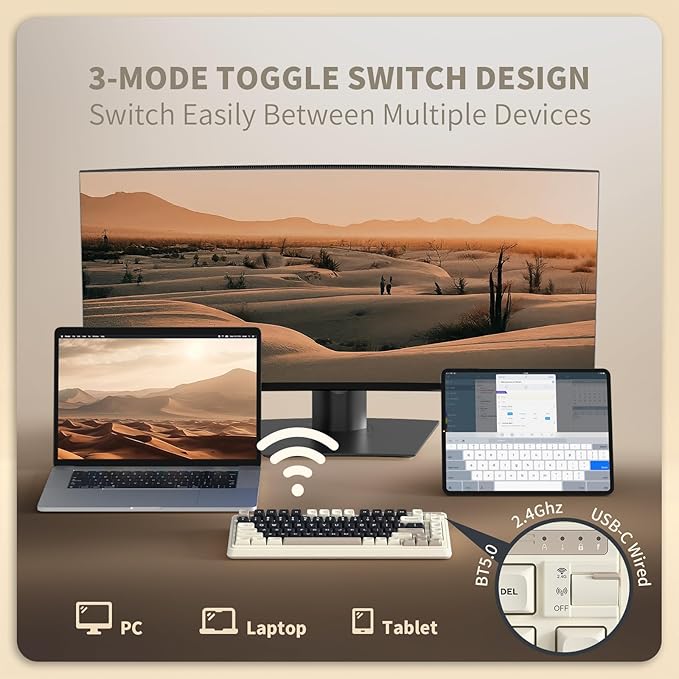 - Tri-Mode Connectivity - Toggled easily among stable USB-C wired mode, hassle-free 2.4GHz wireless, and low-latency BT 5.0 modes with the intuitive knob of this wireless keyboard, and connected to up to five devices at the same time to meet your needs of work, gaming, or study.
