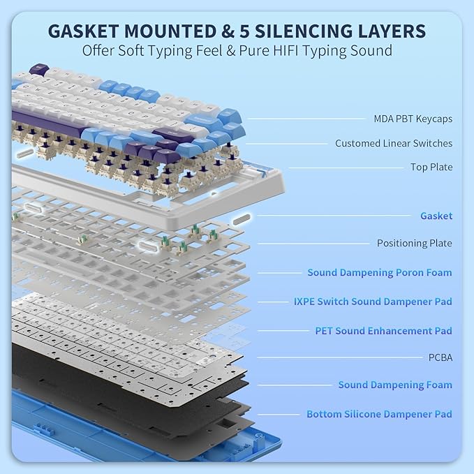 - Five-Layer Sound Padding - With five layers of internal padding, including four sound-dampening mats that significantly minimize hollow sounds and cavities noise and one PET sound-enhancement film. Enjoy a remarkably smooth typing experience and HIFI acoustic feedback with each keystroke.