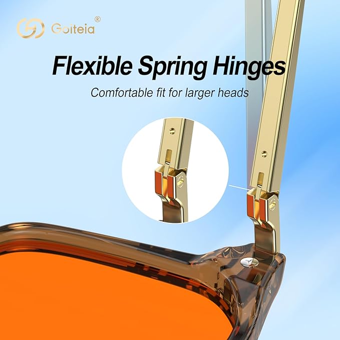 - Super Comfortable Frame: Goiteia orange blue light blocking glasses feature a lightweight and durable TR90 frame combined with high-quality metal temples, offering an elegant look. The glasses are equipped with flexible spring hinges that adjust to different face shapes, making them especially comfortable for those with larger heads or wider faces