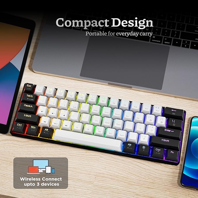 Newmen GM610 60% Wireless Mechanical Gaming Keyboard,Wired/Bluetooth/2.4G Keyboard,RGB Backlit,61 Anti-Ghosting Keys,Programmable,Hot-Swappable,for Windows Mac Android (Black-White/Red Switch)