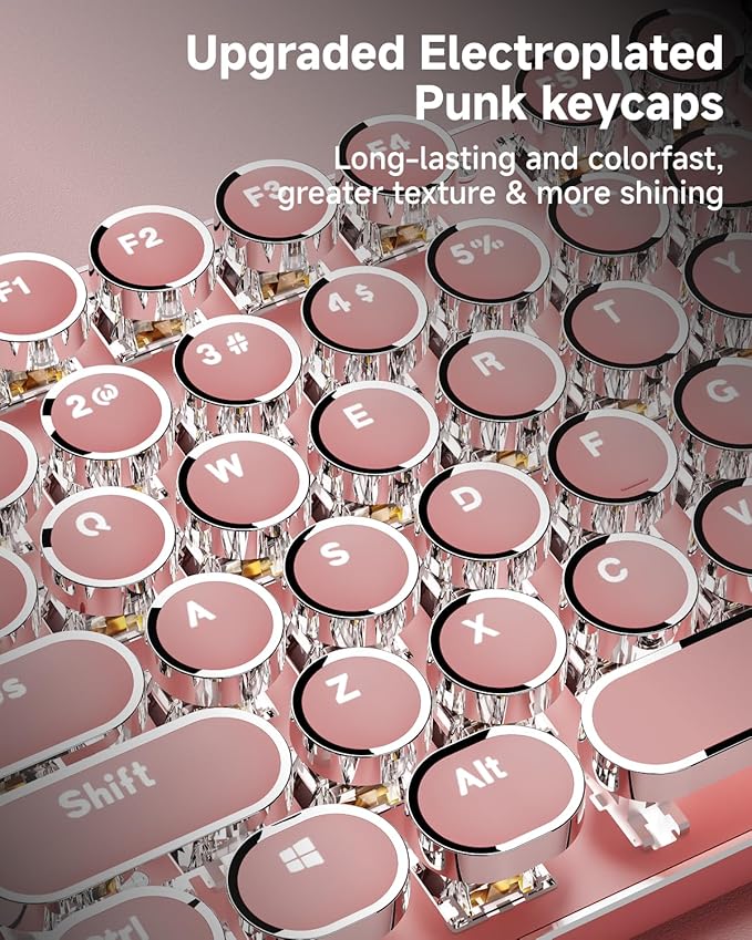 - Retro Typewriter Style Round Keycaps: TK950 wireless typewriter keyboard uses double-shot injection retro punk round keycap with clear backlight, extremely durable. Stepped floating keycaps that fit your fingertips perfectly, precise position. Ergonomic foot support makes typing less tiring and more comfortable. Highly-durable mechanical blue switch responds faster and more quickly, accompanied by crisp click