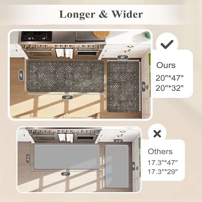 - Wider & Longer Kitchen Rugs 2PC:The set contains 2 rectangular kitchen mats measure 20"x47"+20"x32" which are wider than ordinary kitchen mats on the market.The mats are made of premium materials, which are friendly to your kids and pets