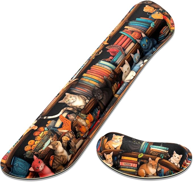 Dapesuom Enlarge Keyboard Wrist Rest, Memory Foam Wrist Cushion for Desk Mats Support, Cute Typing Pain Relief Keyboard Mouse Pad Rests Set with Non-Slip Base for Gaming Laptop Computer, Library Cats