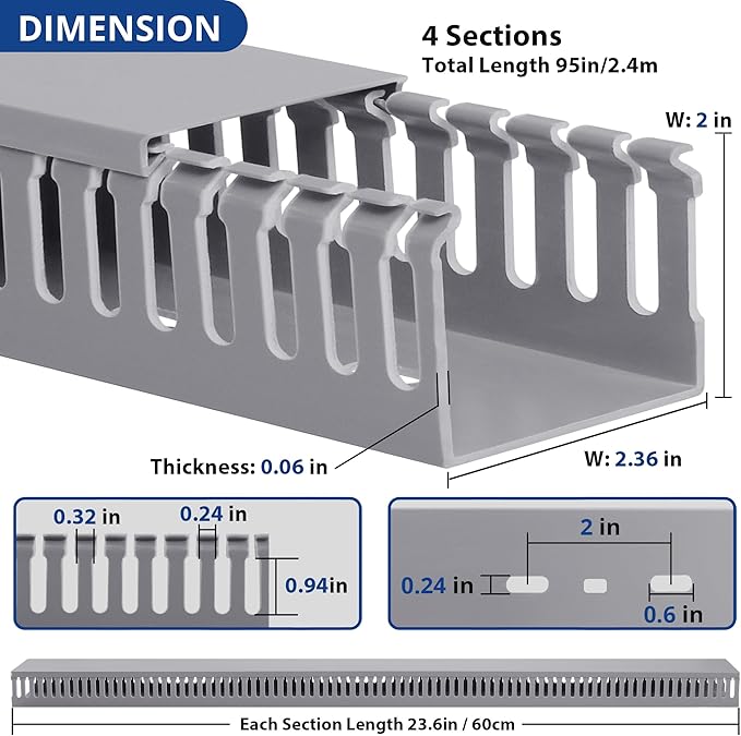 - Specification: Standard open slot cable raceway teeth W0.32in/8mm, wiring outlet width 0.24in/6mm. External dimension: H2in x W2.36 in. Includes 4x 23.6in (60cm) cable raceways; Its Large capacity can accommodate up to 50 network cables