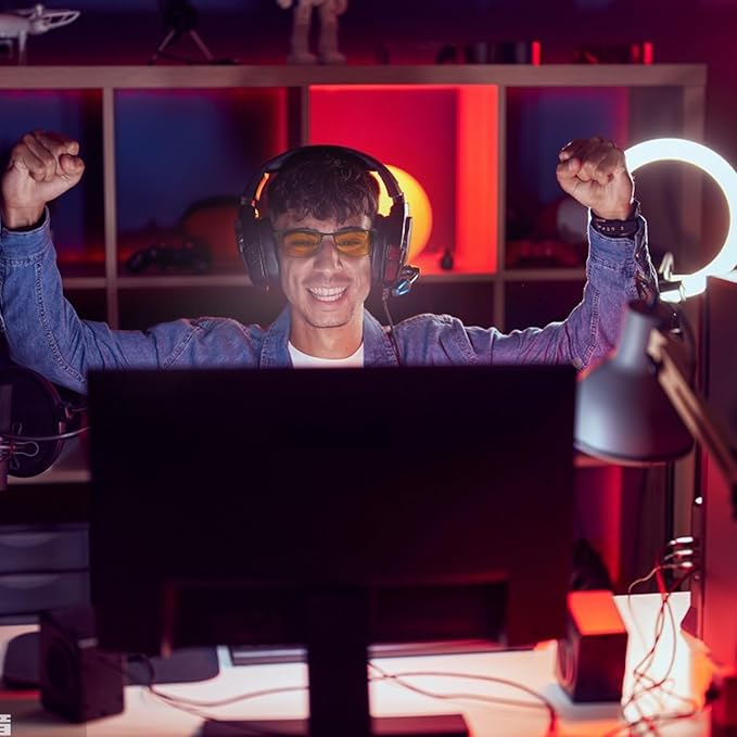 - Upgraded 8-Layer HD Amber Tint Lenses : Our amber-tinted glasses are 4.0 upgraded and provide superior contrast and visual performance while gaming. They reduce screen glare and filter out harmful blue light, protecting your eyes from digital eye strain and headaches. The lenses adopt 8 advanced technologies and offer 100% UV400 protection, reducing eye fatigue and increasing focus, making you more efficient when working or using the computer.