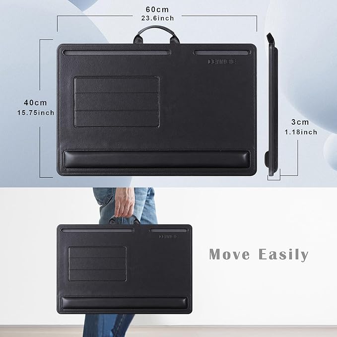 - Extra Large Desktop: Lap desk measures 24" x 16" x 1.2" (60 x 40 x 3cm), perfect for adult men, women. The 24 inch oversized lap desk can fit laptops up to 19" and below, for laptops 17 inch or smaller, lap desk has enough surface space for mouse. Lap desk’s tablet slot measures 12.6" x 0.6" and can hold iPad 12.9" (with case), phone slot measures 6.7" x 0.6" and can hold iPhone Pro Max 6.9" (with case).