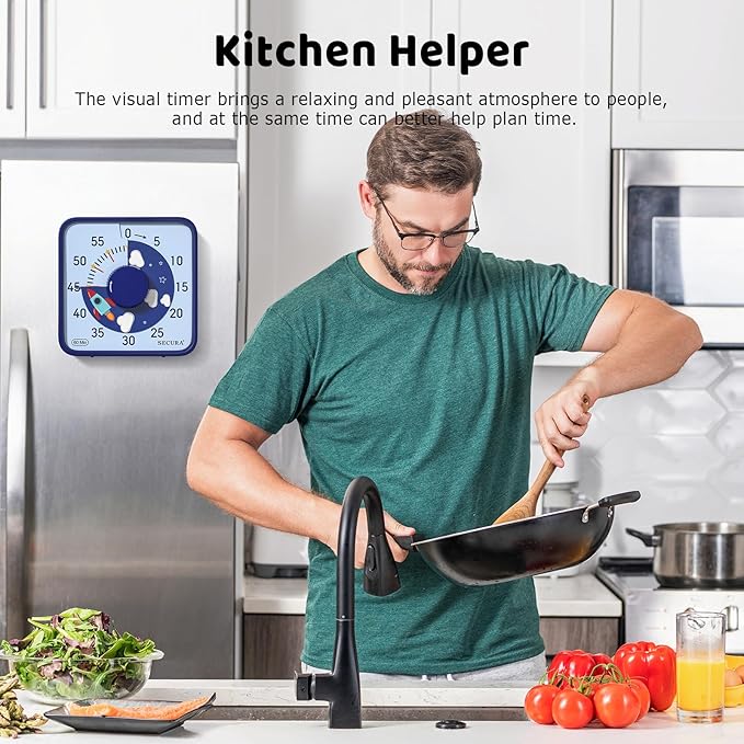 Secura 7.5-Inch Rocket Pattern Visual Timer for Kids, 60-Minute Countdown Timer for Classroom or Kitchen, Durable Mechanical Timer Clock with Magnetic Backing (Blue)