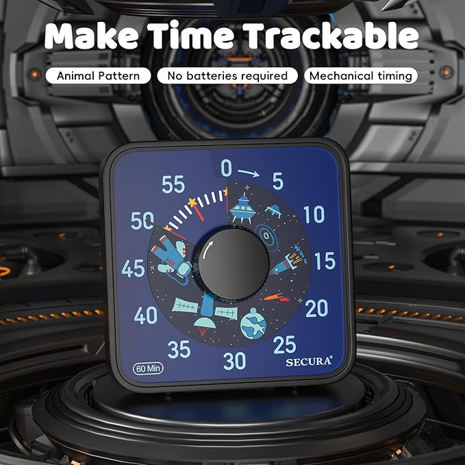 Secura 7.5-Inch Astronaut Pattern Visual Timer for Kids, 60-Minute Countdown Timer for Classroom or Kitchen, Durable Mechanical Timer Clock with Magnetic Backing (Black)