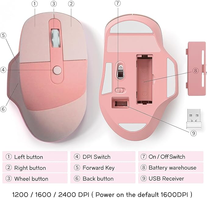 - 【3-LEVEL DPI ERGONOMIC MOUSE】 Press the DPI button to switch between 1200/1600/2400 DPI. By changing the DPI, you can adjust the cursor movement speed, making the mouse more suitable for your usage.(Default 1600 DPI). The part of the palm holding the mouse is covered with high-quality PU leather. More comfortable to hold and non-slip.