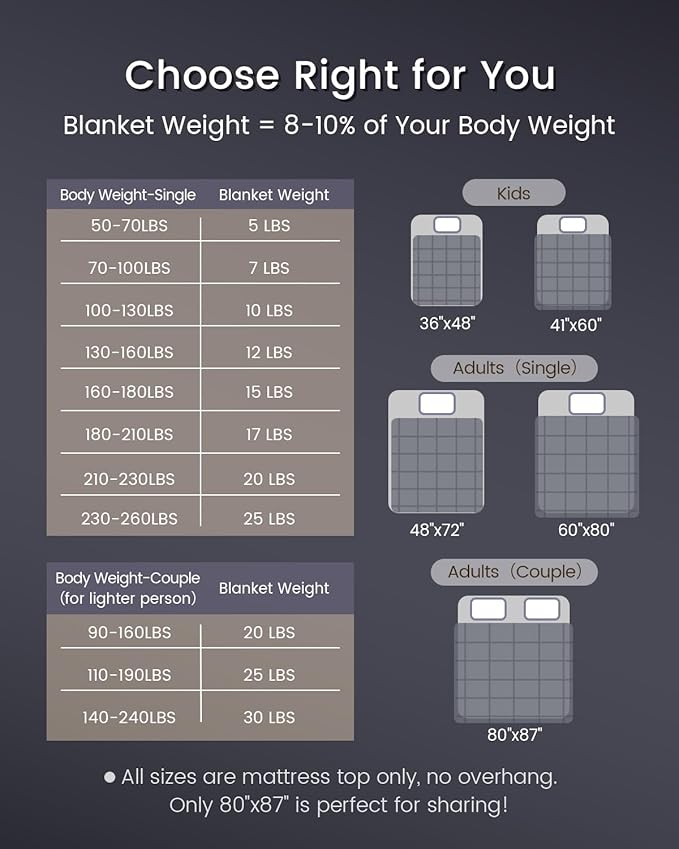 - 【HOW TO CHOOSE SIZE】Weighted blankets for adults, we recommend choosing from sizes 48"x72", 60"x80", and 80"x87". We offer a variety of size options, including Queen, Twin, King and more. For kids, we suggest sizes 36"x48" and 41"x60". PLEASE NOTE that weighted blankets are SMALLER than traditional comforters as they are designed to concentrate the weight on your body rather than hanging off the edges of the bed.
