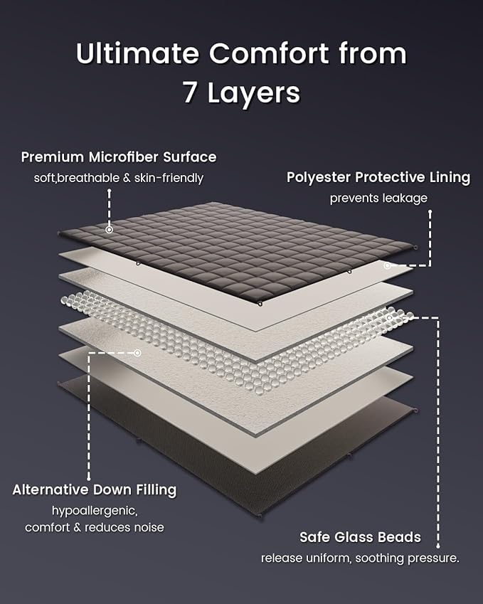 - 【UPGRADED 3.0 VERSION】ZonliI all size weighted blankets feature 5"x5" compartments with upgraded precision stitching and a 5+2 layer lining to prevent bead leakage and shifting. Filled with temperature-regulating glass beads, they ensure even weight distribution and year-round comfort.