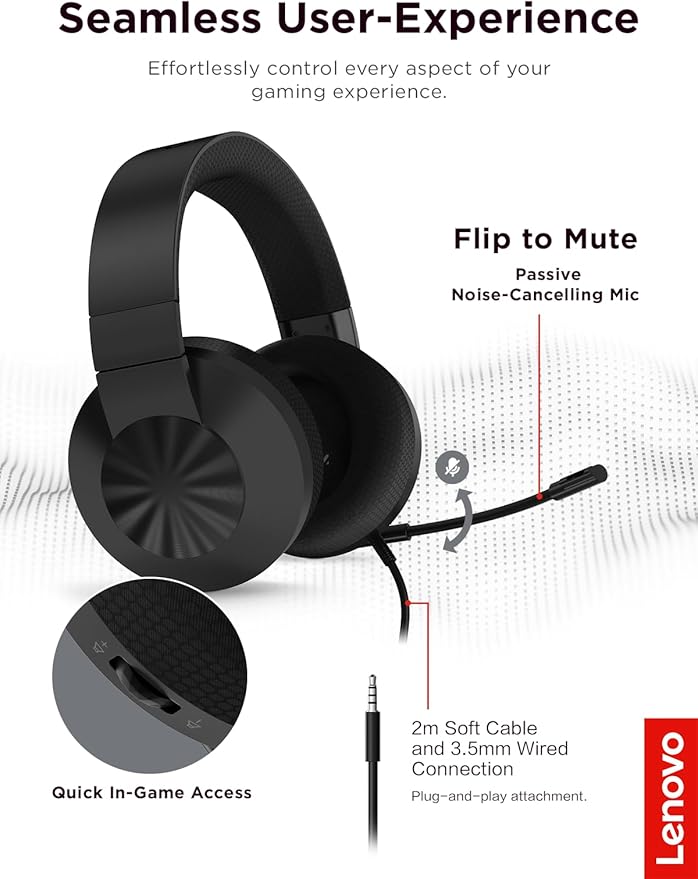 Lenovo H210 Wired Gaming Headset - 3.5mm Connection, Flip-to-Mute Noise-Cancelling Microphone, Breathable Ear Cups - Black