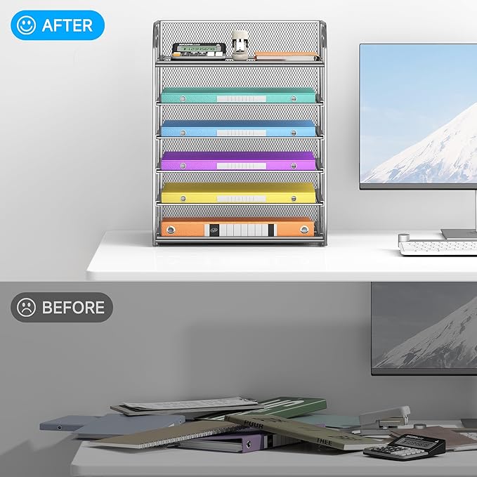 6 Tray Paper Organizer Letter Tray with Handle - Mesh Desk File Folder Holder, Paper Sorter for Office, Home or School - Silver