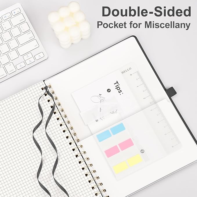 - PRACTICAL LAYOUT: Equipped an elastic band, a pen holder and removable bookmark ruler to keep your notebook organized. Comes with a DIY bookmark with a ribbon for self-attachment to the spiral, serving as a bookmark. Features a double-sided pocket for storing miscellany and 18pcs sticky notes for additional organization and reminders