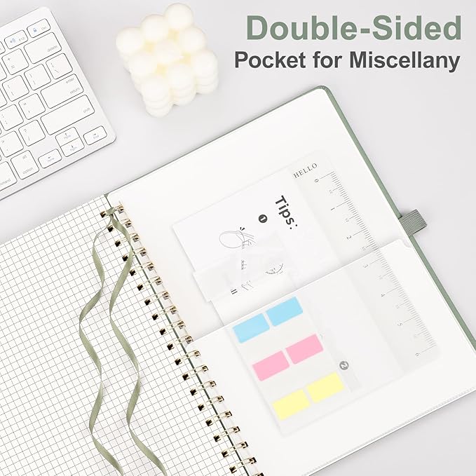 - PRACTICAL LAYOUT: Equipped an elastic band, a pen holder and removable bookmark ruler to keep your notebook organized. Comes with a DIY bookmark with a ribbon for self-attachment to the spiral, serving as a bookmark. Features a double-sided pocket for storing miscellany and 18pcs sticky notes for additional organization and reminders