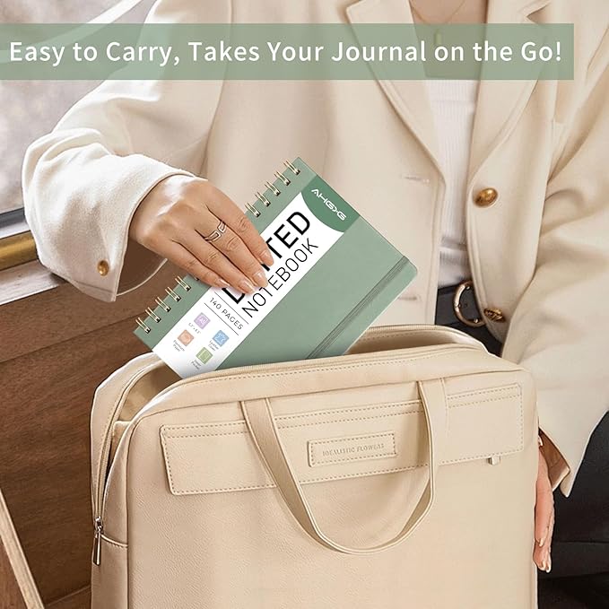 AHGXG Bullet Dotted Journal Spiral Notebook, Hardcover Leather Dotted Notebook 140 Pages, A5 Dot Grid Paper Notebook, 100 gsm Thick Paper, for Bullet Journaling, 5.7" x 8.3", Sage Green
