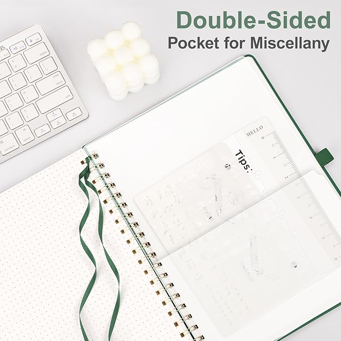 - PRACTICAL LAYOUT: Equipped an elastic band, a pen holder and removable bookmark ruler to keep your notebook organized. Comes with a DIY bookmark with a ribbon for self-attachment to the spiral, serving as a bookmark. Features a double-sided pocket for storing miscellany and 2pcs journal stencil for adding creative to your pages