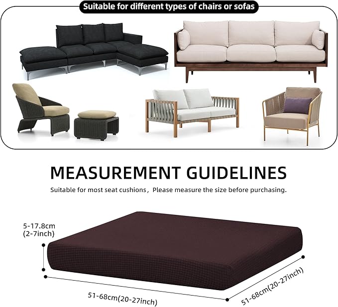 - This outdoor balcony seat cushion set consists of 8 pieces. These seat cushion sets are suitable for most sofa cushions, with dimensions ranging from 20 to 27 inches in length, 20 to 27 inches in width, and 2 to 7 inches in height (51 to 68 centimeters in length, 51 to 68 centimeters in width, and 5 to 17.8 centimeters in height). They are made of 92% polyester fiber and 8% spandex, with a smooth texture, resistant to wrinkles, easy to clean, waterproof, and won't sag over time. The fit is excellent, allowing for easy adaptation to various shapes and sizes of cushions. No need to replace the filling; simply replace the sofa cover. Before purchasing, measure the size of your sofa cushion.