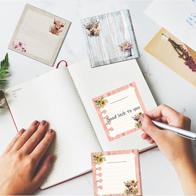 - Size & Design: The highland cow sticky note set measures 3*3 inches, about 7.62*7.62 cm, easy to carry around, while the size is big enough to hold your daily notes. The highland cow sticky note set has a cute highland cow theme with patterns and colors reminiscent of farms and estates.