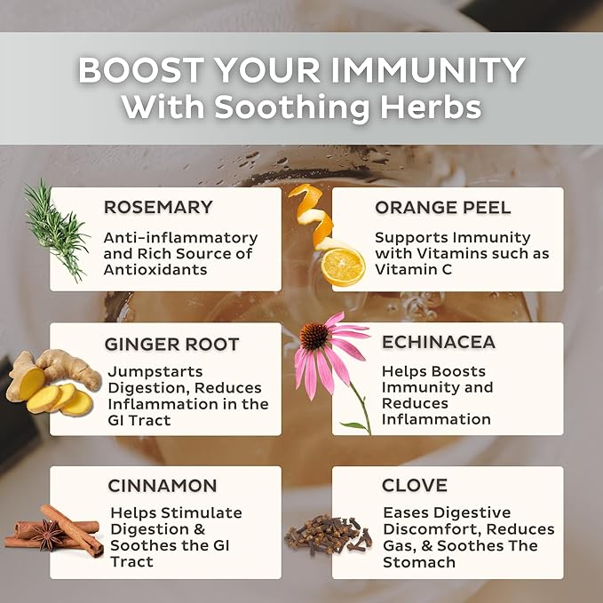 - IMMUNE BOOSTING & ANTIOXIDANT-RICH: Strengthen your body's natural defenses with our immunity tea, enriched with Echinacea, a popular immunity booster. Packed with antioxidants, thanks to the added Rosemary, this tea helps protect your body from free radical damage