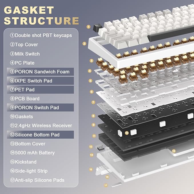- 99 keys 98% Layout Gasket Keyboard with 5-Layer Sound Filling: This computer keyboard adopts gasket structure, which provides a consistent, softer, and more comfortable typing feel and pleasing acoustic feedback. Equipped with PC plate, PORON sandwich pad, IXPE switch pad, PET sound absorbing pad, slot PCB board, PORON switch pad, and silicone button pad, the mechanical keyboard reduces hollow sound and fatigue, it is an ideal keyboard for long-term gaming keyboard use and gamers