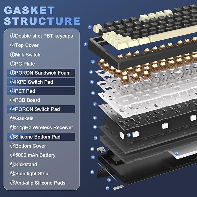 - 99 keys 98% Layout Gasket Keyboard with 5-Layer Sound Filling: This computer keyboard adopts gasket structure, which provides a consistent, softer, and more comfortable typing feel and pleasing acoustic feedback. Equipped with PC plate, PORON sandwich pad, IXPE switch pad, PET sound absorbing pad, slot PCB board, PORON switch pad, and silicone button pad, the mechanical keyboard reduces hollow sound and fatigue, it is an ideal keyboard for long-term gaming keyboard use and gamers