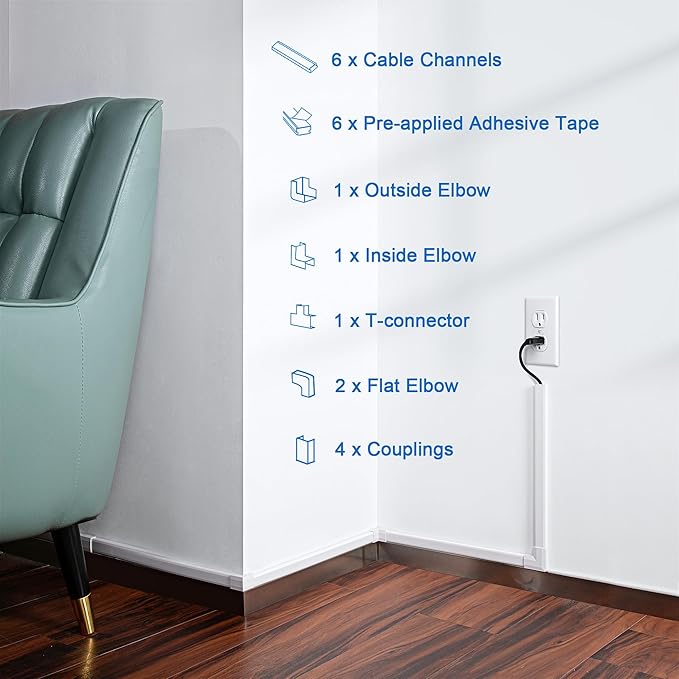 - Easy to Install: Pre-applied super-strong double-sided tape, no drilling required; Easily cut and features an abundance of connectors; Snap-on or slide design enables flexible wire management even in tight spaces, installing in just 10 minutes