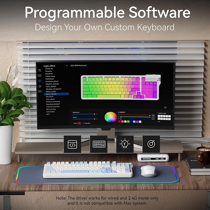 - PROGRAMMABLE SOFTWARE SUPPORT: Expand your options to customized key setting, 16.8 million RGB light effects, macro and music rhythm via driver, and meet your diverse needs and different scenarios.(Note: The driver can only be used in wired and 2.4G mode and is not available on Mac systems.)