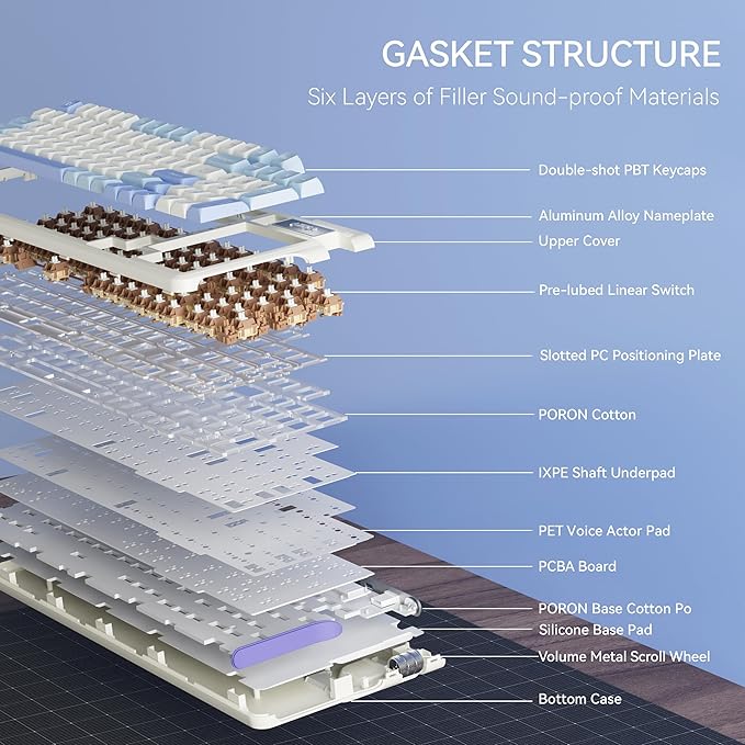 - INNOVATIVE GASKET STRUCTURE: Adopt a gasket mount with six layers of sound deadening layers and stabilizers to better reduce the hollow sound and optimize stability, provide a solid and clean sound keystroke like creamy or thocky keyboard sound. Full-key anti-ghosting which simultaneous operation without conflict and quick response, allow you to play gaming without hindrance.