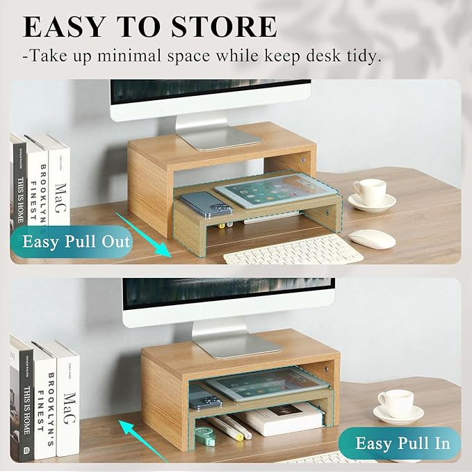 TEAMIX Pull Out Monitor Stand Riser-2 Pack,Wood 2 Tier Adjustable Monitor Stand Dual Monitor Riser for 2 Monitors/Laptop/PC Computer Stand Desktop Space Saver…