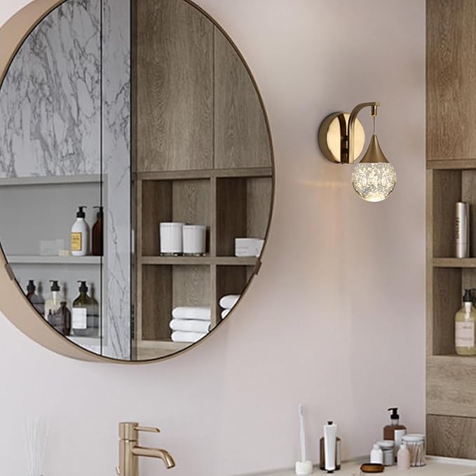 LED Wall Sconces Dimmable, Modern Crystal Wall Sconce Indoor, Bubble Wall Light for Bedroom Bathroom Living Room Dining Room Hallway, Brass