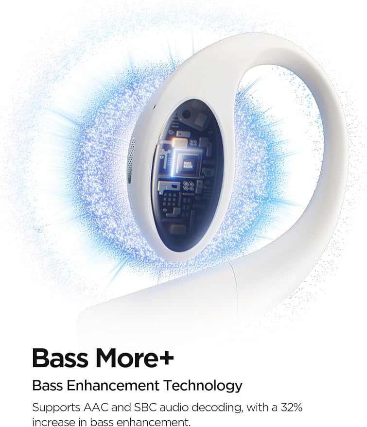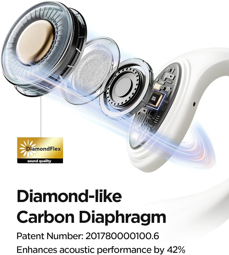 - Exceptional Sound Quality: Featuring a patented diamond-like diaphragm driver, our open ear earbuds deliver a 42% boost in acoustic performance. With Bass More+ technology, enjoy richer, more immersive audio with enhanced bass that supports AAC and SBC codecs, all while staying aware of your environment