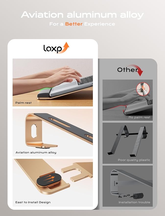 - 【Solid and Sturdy Metal Stand】This laptop wrist support is designed by engineers of loxp based on the concept of triangle stability. Three different force points provide strong support for your laptop device. All three sides are made of durable and tight aluminum alloy material. It is detachable and does not require screws. It is easy to assemble and disassemble. You can use it as a travel laptop stand because it is easy to carry.