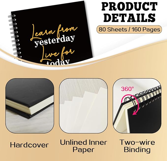 - Practical Design: Our notebooks are bound with double spiral coils, can be folded 360° freely without creases, and the pages can be easily torn off without falling apart. The unique design and color scheme on the black hard cover add a personalized touch to your note-taking experience and make your notebook no longer boring