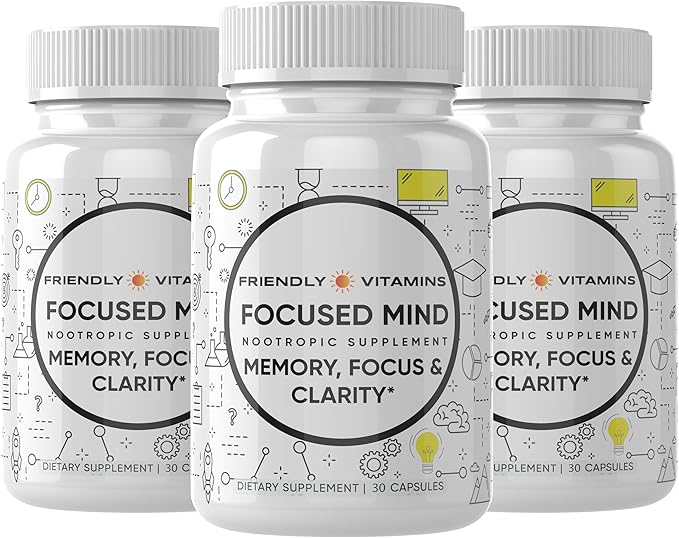 - π¦π¨π£π£π’π₯π§π¦ ππ’ππ¨π¦ & ππππ₯ππ§π¬ β Friendly Vitamins Focused Mind is a focus supplement and brain supplement formulated to help support clarity, attention, and concentration. Ideal for busy individuals seeking support overall well being ,throughout the day .Organic herbs nootropics brain support .
