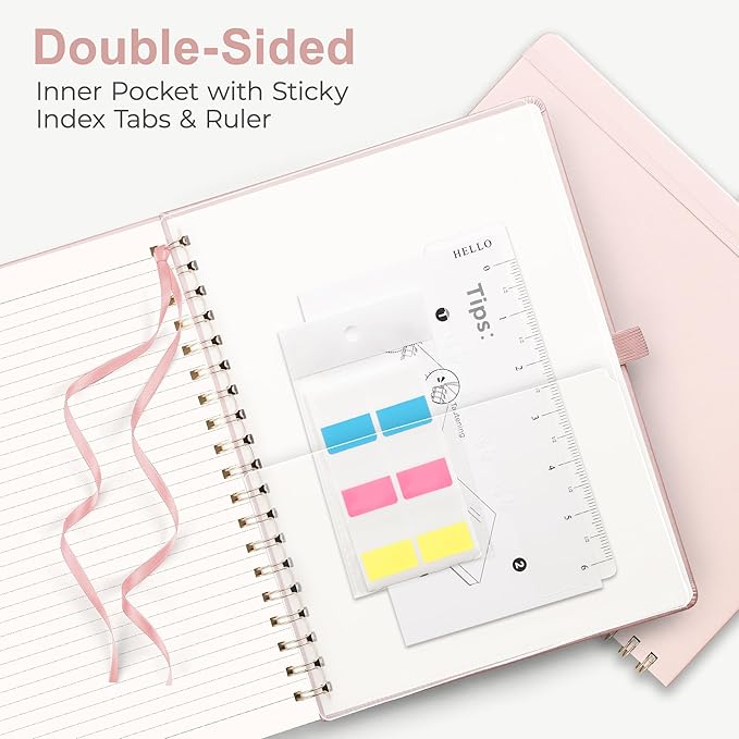 - SPIRAL NOTEBOOK: RETTACY Spiral Notebook comes in a A4 (8.5'' × 11'') size, 110 Numbered Pages, Leather Hardcover, Sturdy Twin-wire Spiral Bound, 7 mm college ruled writing space, 100 GSM Paper, Pen Holder, Elastic Closure Bands, Inner Pocket, Ribbon Bookmark, Lightweight Ruler, Sticky Index Tabs