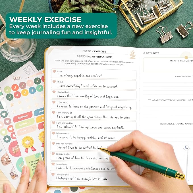 - ENCOURAGE GROWTH WITH WEEKLY EXERCISES – Each week features a thoughtful writing exercise to dive deeper into your thoughts and emotions, promoting personal growth and reflection.