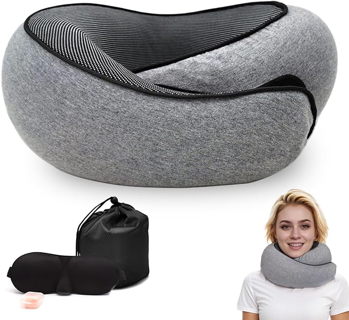 - Best Space Saving Travel Partner:This memory foam travel neck pillow is designed to provide ergonomic neck support during airplane and car travel, ensuring a comfortable sleep.(Set includes: neck pillow + eye mask + earplugs + waterproof storage bag)
