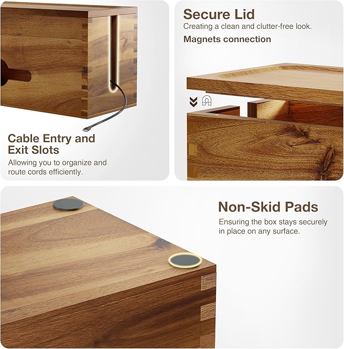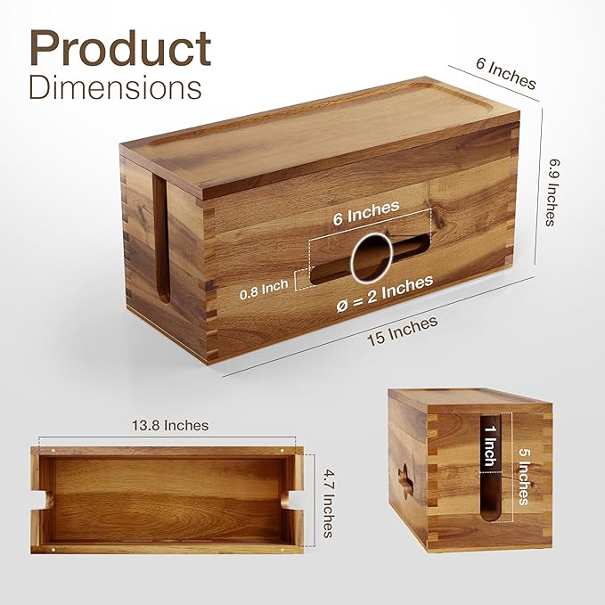 - High-Quality Acacia Wood: Crafted from durable acacia wood with a smooth natural finish, this cable management box is built to withstand daily use while adding understated sophistication to any space. Its generous 15"L x 6"W x 6.9"H size accommodates most power strips, surge protectors, and excess cables—keeping your setup tidy without taking up unnecessary room.