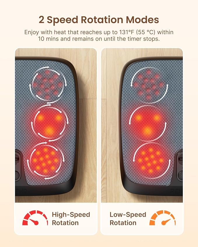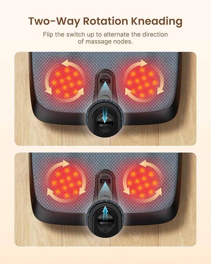 - Intelligent Heating Function: Renpho heated foot massager allows you to select high or low-speed rotation modes. It heats up to 131°F (55°C) within 10 minutes and maintains a constant temperature, which may help relieve discomfort. It also features automatic safety shutoff and overheating protection