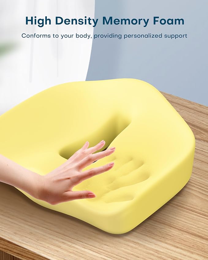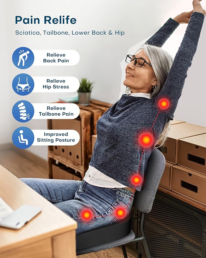 - 【Pain-Relief Design】Experience all-day comfort with seat cushion, expertly designed to relieve sciatica and back pain by evenly distributing weight and reducing pressure on your lower back, hips, and tailbone. Its adaptive shape supports your posture for 8-10 hours, making it ideal for long workdays. Enjoy enhanced comfort and healthier sitting with this premium cushion