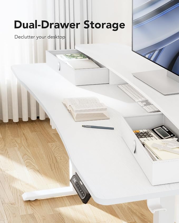 - Efficient Desktop Organization: The electric standing desk maximizes organization with two desktop drawers to store items out of sight and an open storage cubicle for your keyboard, mouse, and other accessories. With a spacious 48″ desktop, you also have plenty of room to display your favorite decorations and collectibles.