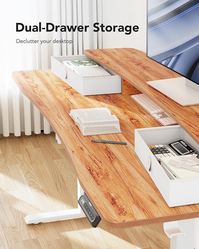 - Efficient Desktop Organization: The electric standing desk maximizes organization with two desktop drawers to store items out of sight and an open storage cubicle for your keyboard, mouse, and other accessories. With a spacious 48″ desktop, you also have plenty of room to display your favorite decorations and collectibles.